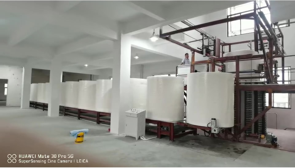 全自動垂直連續發泡生產線,因為其工藝的特殊生,一般僅用于密度10-35kg/ m3范圍的海綿生產,發泡出來的半成品呈圓柱形狀,用圓切機切割成海綿卷材,用于與其它材料復合成復合材料。具有占地面積小、生產方便等特點。