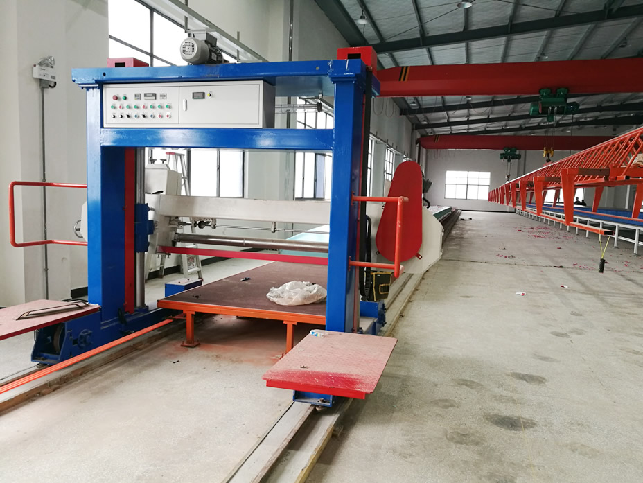 用于連續水平發泡線生產的長條海綿(長度超過3米,常用50米,現在也有100米的)的切片,海綿需要人工收卷,或是設備輔助收卷,切割機是在鐵軌上運行,切割海綿易出現刀紋。